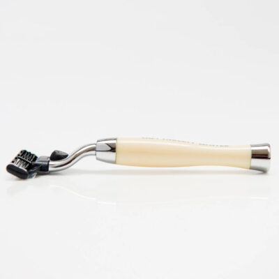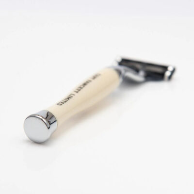 Aparat de ras compatibil Mach3 Captain Fawcett Finest Hand Crafted Safety Razor este un dispozitiv de barbierit premium frumos lucrat cu ajutorul caruia veti descoperi un aparat perfect echilibrat, magnific care este pur si simplu o incantare de utilizat. Adevarata experienta a barbieritului umed traditional este acum disponibil pentru toti aventurierii moderni. Maner imitatie fildes cu guler si baza cromate. Dimensiuni: Lungime: 130 mm Lungimea manerului: 87 mm Montare: Gillette Mach 3 (lama furnizata) Greutate: 47 grame