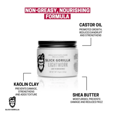 Styling fără efort? E “Lightwork”. Așa cum îi spune și numele, Slick Gorilla Lightwork face ca aranjarea părului să pară o joacă de copii. Această ceară de păr este un “Game Changer” pentru bărbații care vor un look proaspăt, plin de textură, dar care să pară complet natural, fără pic de luciu.