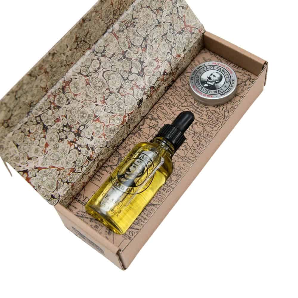 Un set cadou de lux special coceput pentru domnul care acorda o importanta deosebita aspectului fizic, limbajului rafinat si hobby-urilor tacticoase, urmarind aparenta nepasarii intr-un cult de sine insusi. Contine: Ceara de mustata Captain Fawcett Private Stock Moustache Wax 15ml Ceara de mustata Captain Fawcett’s Private Stock Moustache Wax este o un produs de lux cu parfum subtil pentru un gentleman care intentioneaza sa isi pastreze aspectul mustatii impecabil pe intreaga durata a zilei. Descoperita printre actele private ale capitanului Fawcett aceasta a fost reteta pentru propria sa ceara personala pentru mustata. Respectarea fidela a acestor instructiuni meticuloase a permis ca produsul sau, in forma sa originala, sa fie recreat si pus la dispozitie pentru prima data dupa un secol. O metoda veche de a-si innobila buza superioara… Ingrediente: Cera Flava, Paraffinum-Liquidum & Lavendar (Lavandula Augustifolia) essential oil Ulei de barba Captain Fawcett Private Stock Beard Oil 50ml Uleiul de barba Captain Fawcett Private Stock Beard Oil este un produs premium, luxuriant, de ingrijire a barbii ce are la baza un amestec de uleiuri esentiale cum ar fi uleiul de migdale dulci, Jojoba si Vitamina E. Utilizat zilnic, uleiul de barba Captain Fawcett Private Stock Beard Oil va calma, hidrata si revigora atat pielea, cat si parul facial. Parfum de Cedru, Piper negru, Patchouli & Palmarosa. Fabricat manual, in marje mici, de catre blender-ul capitanului, uleiul vine intr-o sticluta eleganta, insotita de o pipeta din sticla cu varf de cauciuc pentru o dozare precisa. Uleiul de barba Captain Fawcett Private Stock Beard Oil este un produs concentrat ceea ce inseamna ca este suficient sa luati o cantitate mica de produs in palma (cateva picaturi), omogenizati si distribuiti apoi pe toata suprafata barbii. Masati pentru ca produsul sa patrunda bine in piele. Este recomandat ca inainte de utilizarea uleiului de barba Captain Fawcett Private Stock Beard Oil , barba sa fie curatata cu un sampon special de barba. A se evita contactul cu ochii. Ingrediente: Prunus Dulcis (Sweet Almond) Oil, Simmondsia Chinensis (Jojoba) Oil, Tocopherol (Vitamin E), Cedrus Atlantica (Atlas Cedarwood) Oil, Piper Nigrum (Black Pepper) Oil, Pogostemon Cablin (Patchouli) Oil, Cymbopogon Martini (Palmarosa) Oil, Geraniol, Limonene, Linalool. Captain Fawcett isi are originea intr-o legenda care ne spune ca in 1905 Capitanul Peabody Fawcett RN Ret’d a disparut in timp ce naviga catre Ubangi, un afluent major al raului Congo. Pana in anul 1997 nu a fost gasita nicio urma a expeditiei sale, cand a fost achizitionat un cufar vechi dintr-o casa veche. Printre lucrurile mucegaite a fost gasit un pansament rafinat continand alifii, unguente si jurnale de aventura. Printre povestile din jurnal s-au gasit detaliate retetele cu ingredientele exotice pe care le utiliza capitanul in ingrijirea personala. Acele formule au fost reproduse intocmai, iar astazi, impreuna cu renumita ceara de mustata si potiunile originale Fawcett, sunt in topul preferintelor barbatilor din intreaga lume.
