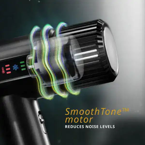 - Sistemul SmoothTone™: O inovație acustică ce elimină frecvențele dure și deranjante. Menține un volum sonor atât de redus încât poți continua să discuți cu clienții în timp ce usuci părul.